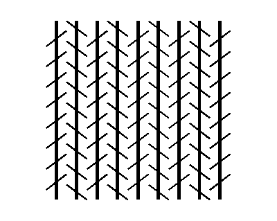 Przykład nr 5 - złudzenie spowodowane naruszeniem rytmu. Linie pionowe są do siebie równoległe. Sprawiają one jednak wrażenie linii pochyłych wskutek umieszczenia na nich linii poprzecznych.